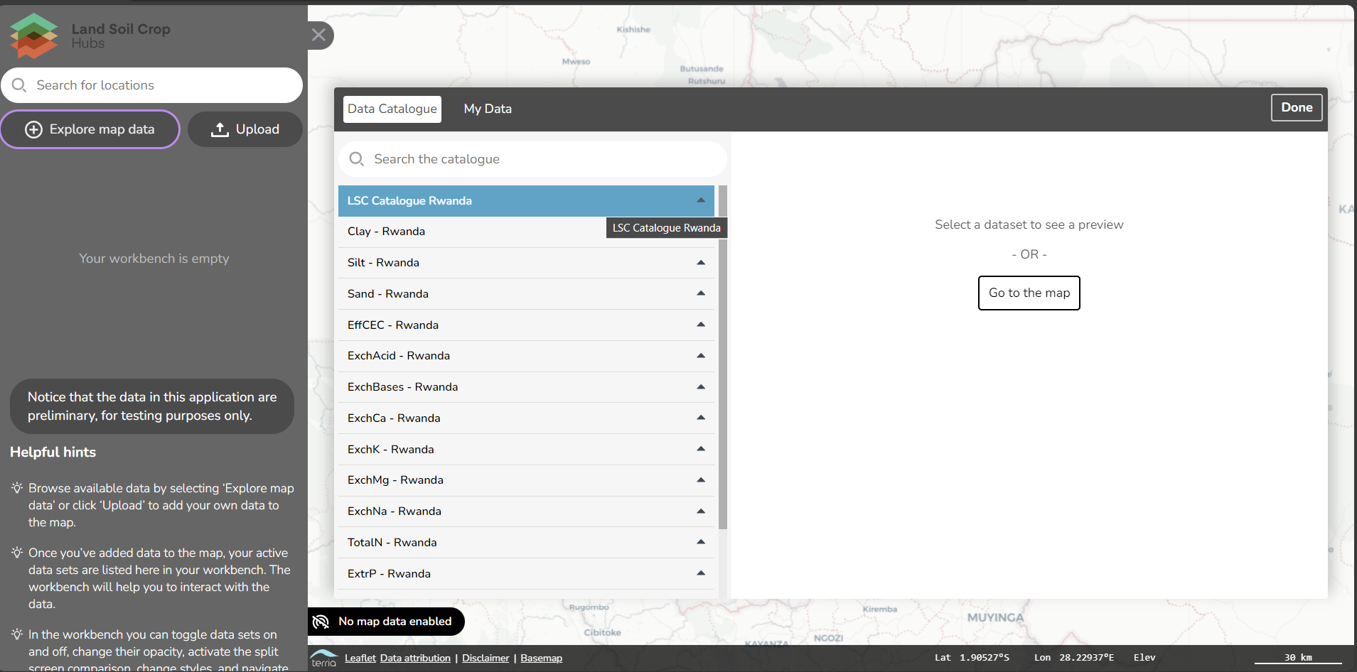 Spatial data can be viewed and compared in a web-based map viewer. The map viewer can be accessed on the homepage of the LSC hub, under DATA and then click on Go the map viewer. This manual provides an overview of the functionality, a full manual of the TerriaJS library is available at https://userguide.terria.io.