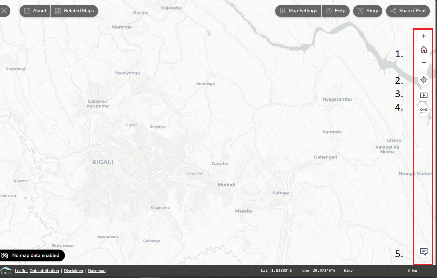 The vertical toolbar allows you to zoom on the map or location, compare maps, measure distance and provide feedback. Each of the buttons will be explained below.